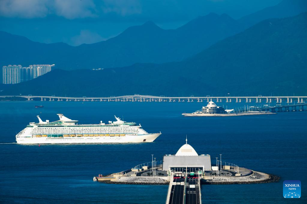 A cruise ship sails past the artificial islands of the Hong Kong-Zhuhai-Macao Bridge, south China, July 27, 2018. The 55-kilometer-long bridge, situated in the Lingdingyang waters of the Pearl River Estuary, is the world's longest bridge-tunnel combined cross-sea passage.