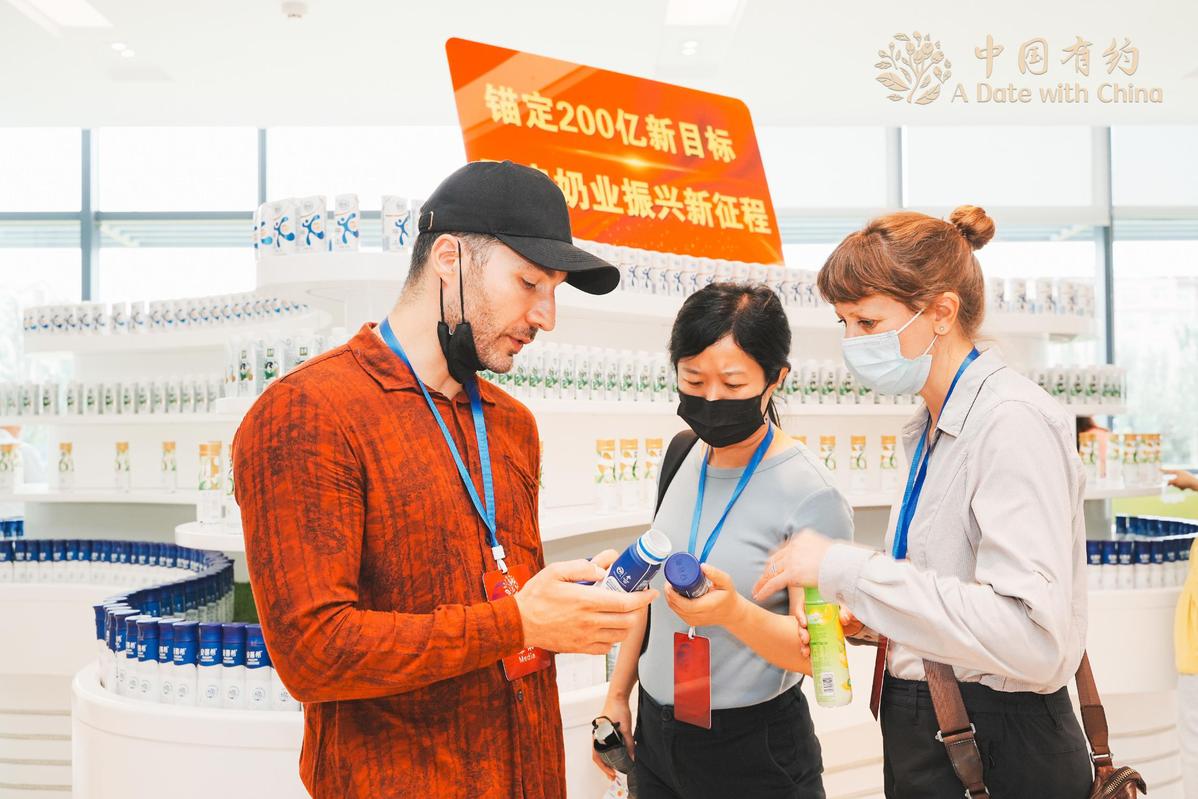 Members of the "A Date with China" 2022 international media tour examine yogurt products at Ningxia Yili Dairy Co Ltd in the Ningxia Hui autonomous region on June 26, 2022. [Photo/chinadaily.com.cn]