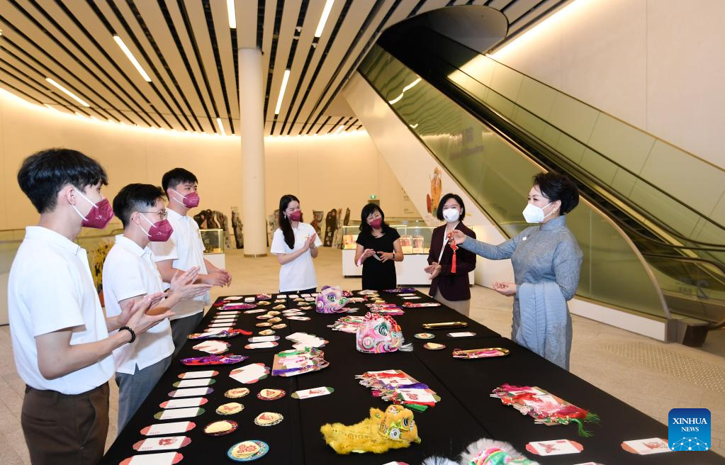 Peng Liyuan, wife of Chinese President Xi Jinping, has exchanges with young volunteers who are making traditional paper artworks during her visit to the Xiqu Center in the West Kowloon Cultural District, in Hong Kong, south China, June 30, 2022. (Xinhua/Shen Hong)