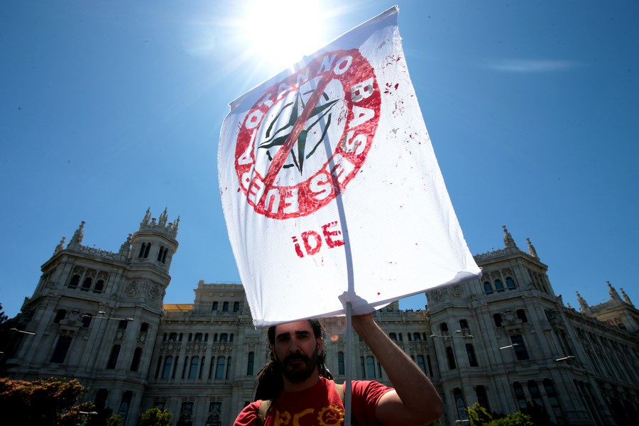 A man takes part in a protest against NATO in Madrid, Spain, June 26, 2022. (Photo by Juan Carlos Rojas/Xinhua)