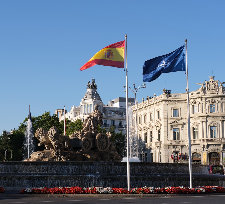 NATO flag and Spanish national flag are seen in Madrid, Spain, June 28, 2022. (Xinhua/Meng Dingbo)