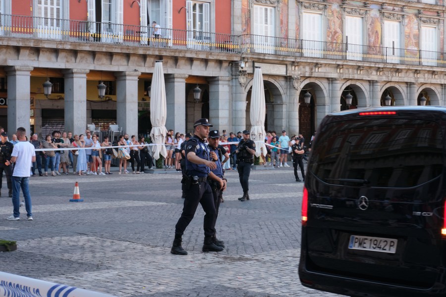Police stand guard at the blocked Plaza Mayor in Madrid, Spain, June 28, 2022. (Xinhua/Meng Dingbo)
