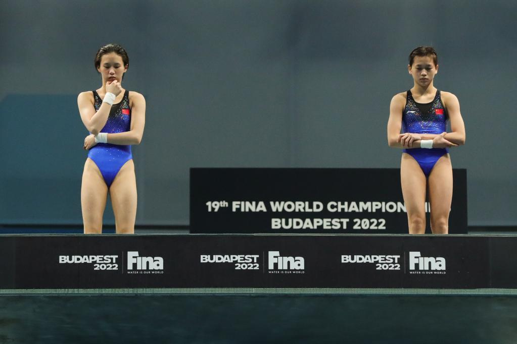 Chen Yuxi (L)/Quan Hongchan of China react during the women's 10m synchronised final of diving at the 19th FINA World Championships in Budapest, Hungary, June 30, 2022. (Xinhua/Zheng Huansong)