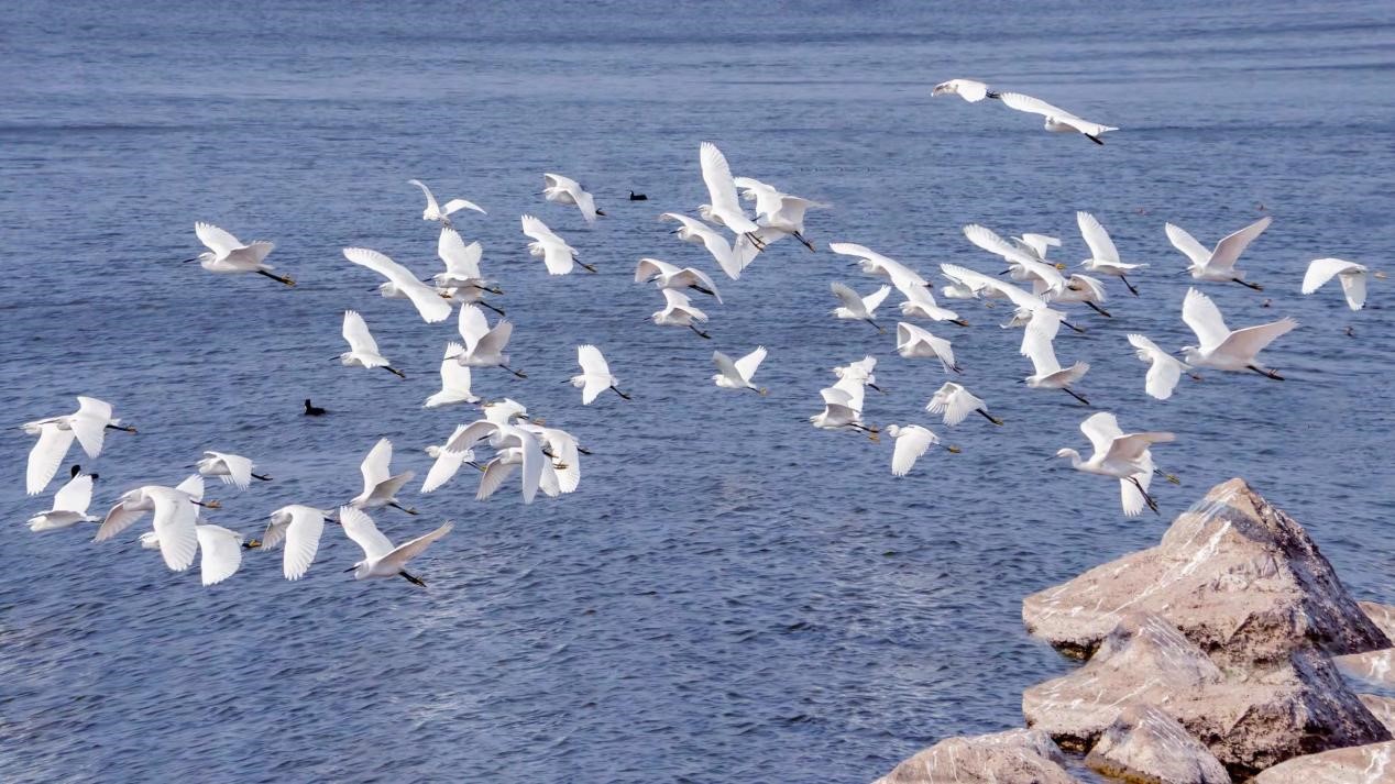 Egrets fly at the seaside in Xiapu county, Ningde city, southeast China's Fujian province, Nov. 7, 2021. (People's Daily Online/ Zheng Peiluan)