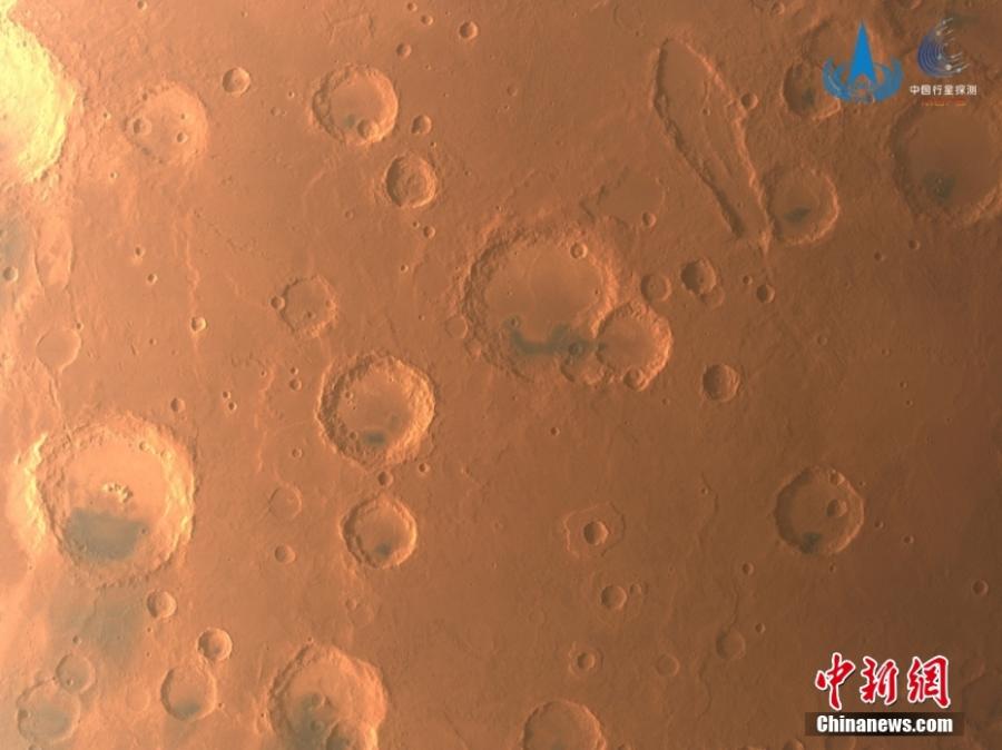 One of the most recent images taken by cameras onboard China's Tianwen 1 Mars orbiter shows dozens of craters located in the Arabia Terra region, June 29, 2022. (Photo released by China National Space Administration)