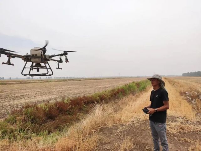 A drone flies over a stretch of farmland to spray pesticides. (Photo courtesy of the interviewee)