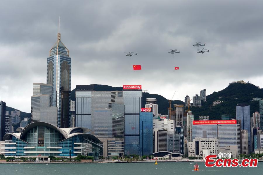 Helicopters with Chinese national flag and the flag of the Hong Kong Special Administrative Region fly over the Victoria Harbor to celebrate the 25th anniversary of Hong Kong's return to the motherland, Hong Kong, July 1, 2922. (Photo: China News Service/Zhang Wei)