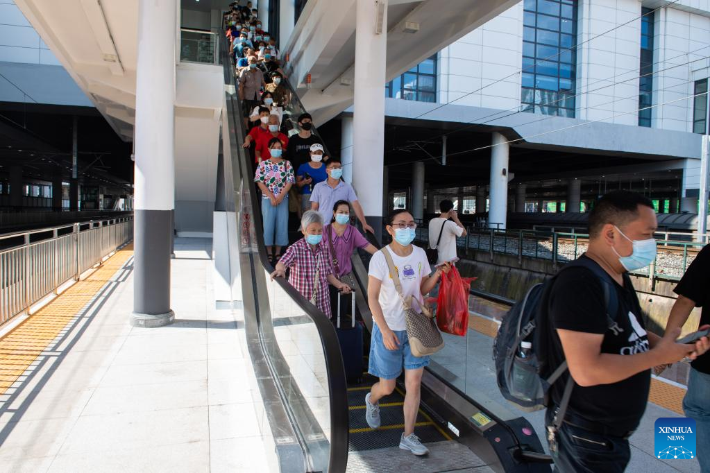 Passengers prepare to board a train at Zhuzhou Railway Station in Zhuzhou, central China's Hunan Province, July 1, 2022. Zhuzhou Railway Station resumed operation on Friday after its upgrade and enlargement construction starting from Oct. 20, 2021. (Xinhua/Chen Sihan)