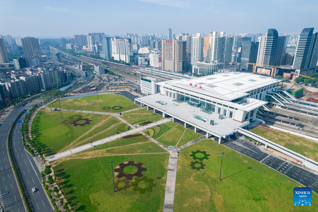 Aerial photo taken on July 1, 2022 shows a view of Zhuzhou Railway Station after construction in Zhuzhou, central China's Hunan Province. Zhuzhou Railway Station resumed operation on Friday after its upgrade and enlargement construction starting from Oct. 20, 2021. (Xinhua/Chen Sihan)