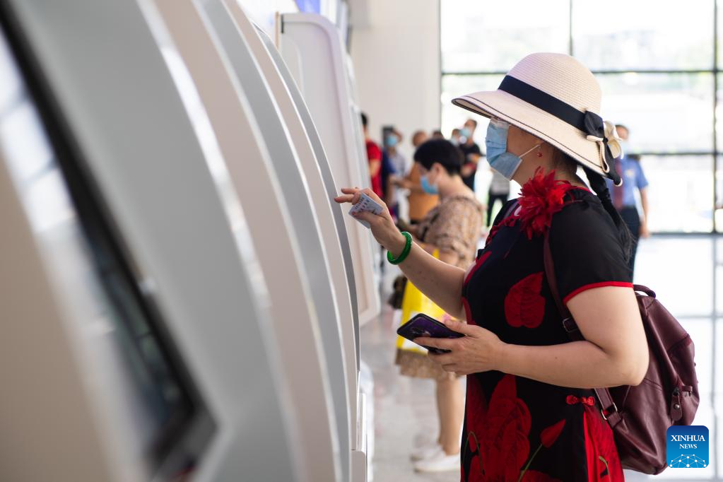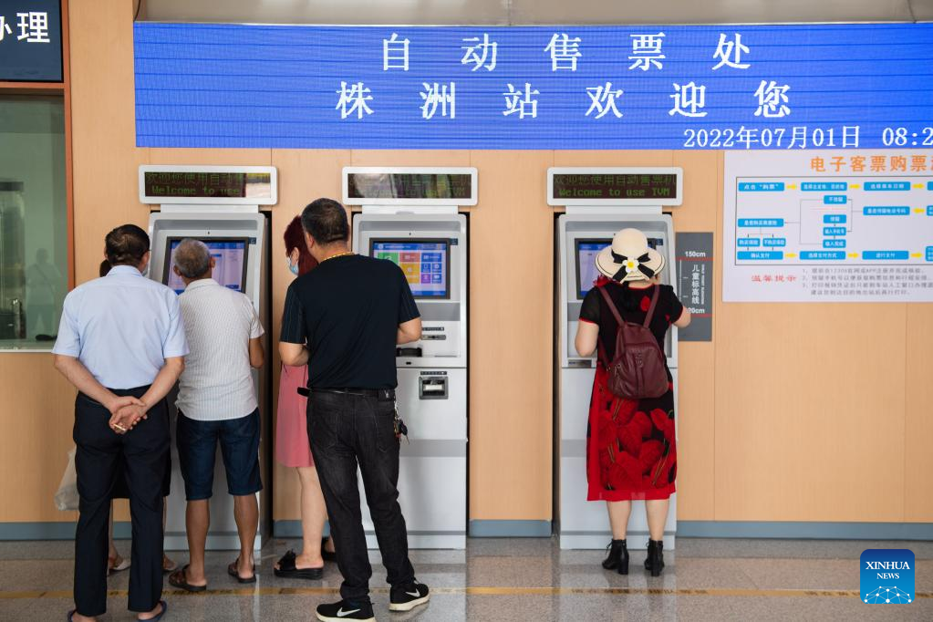 Passengers use ticket vending machines to buy tickets at Zhuzhou Railway Station in Zhuzhou, central China's Hunan Province, July 1, 2022. Zhuzhou Railway Station resumed operation on Friday after its upgrade and enlargement construction starting from Oct. 20, 2021. (Xinhua/Chen Sihan)