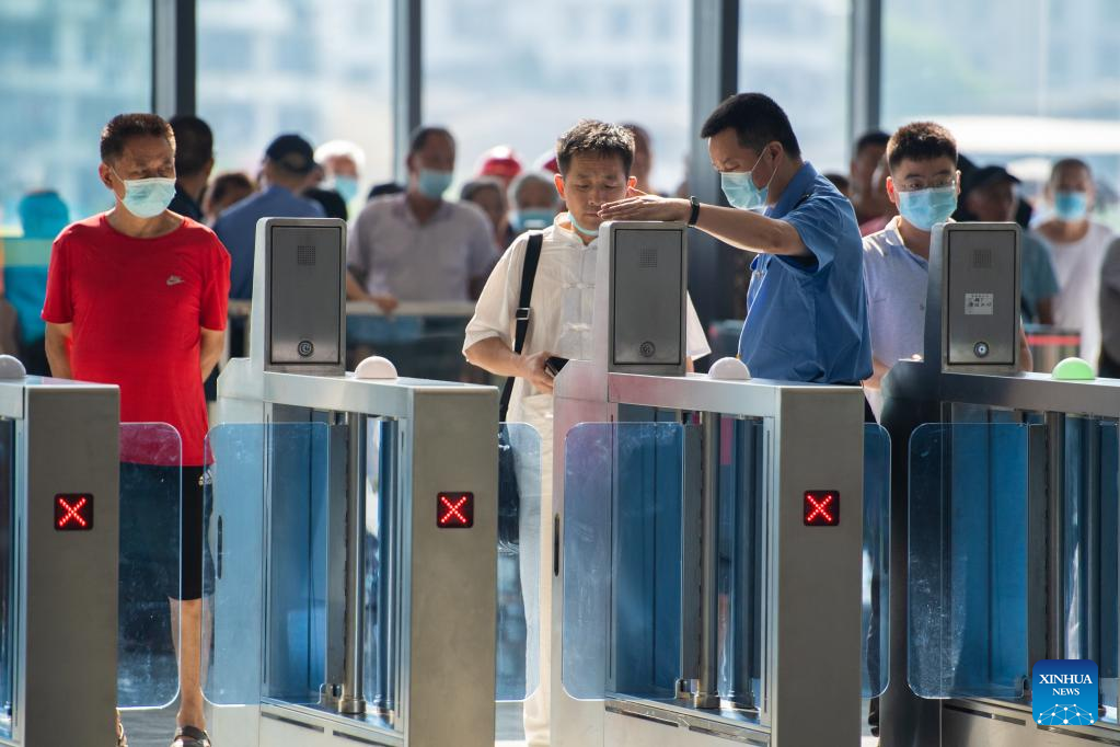 Passengers check in at Zhuzhou Railway Station in Zhuzhou, central China's Hunan Province, July 1, 2022. Zhuzhou Railway Station resumed operation on Friday after its upgrade and enlargement construction starting from Oct. 20, 2021. (Xinhua/Chen Sihan)