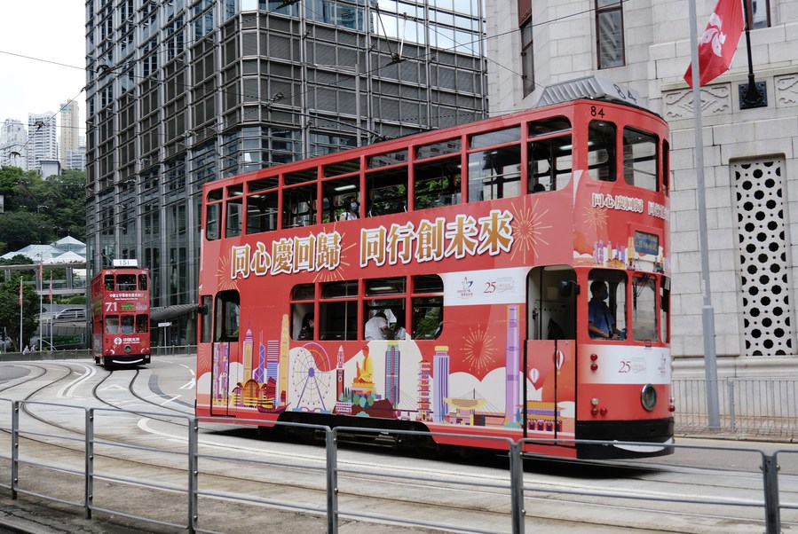 A bus painted with posters marking the 25th anniversary of Hong Kong's return to the motherland runs in Hong Kong, south China, June 30, 2022. (Xinhua/Wang Shen)