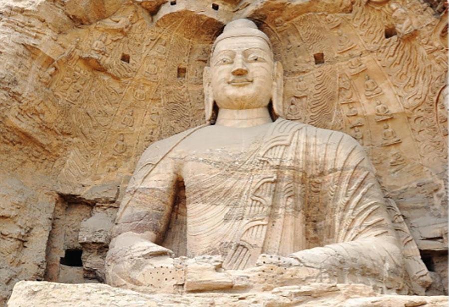 Photo shows a gigantic seated Buddha in the Cave No.20 of the Yungang Grottoes. (Photo by Chen Xiaodong/People's Daily Online)