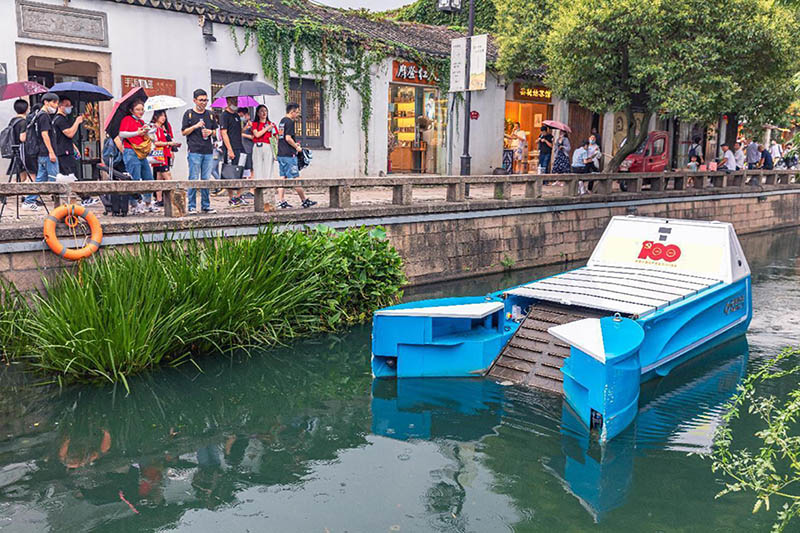 An unmanned cleaning boat is working in a river course in Suzhou, east China's Jiangsu province, July 31, 2021. (Photo by Zhang Feng/People's Daily Online)