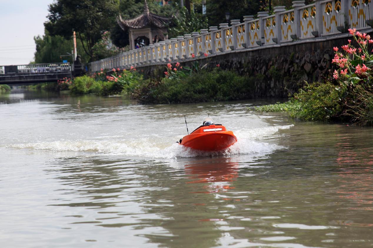 A 5G-enabled boat is patrolling on a river, controlled by the water conservancy office of Hengjie township, Luqiao district, Taizhou, east China's Zhejiang province, Oct. 19, 2021. (Photo by Jiang Youqing/People's Daily Online)