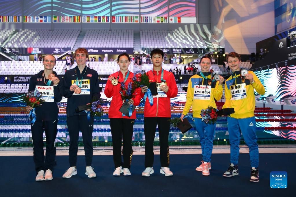 Gold medalists Ren Qian (3rd L)/Duan Yu (3rd R) of China, silver medalists Sofiia Lyskun (2nd R)/Oleksii Sereda (1st R) of Ukraine, bronze medalists Delaney Schnell (1st L)/Carson Tyler (2nd L) of the United States pose after the mixed 10m synchronised final of diving at the 19th FINA World Championships in Budapest, Hungary, July 1, 2022. (Xinhua/Zheng Huansong)