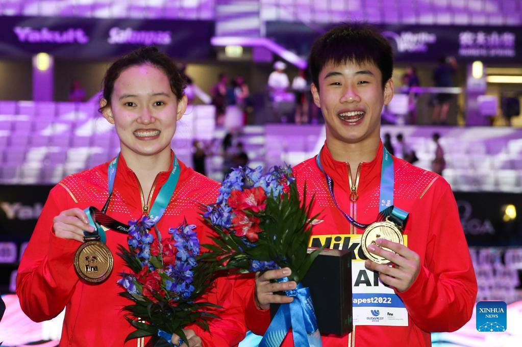 Gold medalists Ren Qian (L)/Duan Yu of China pose after the mixed 10m synchronised final of diving at the 19th FINA World Championships in Budapest, Hungary, July 1, 2022. (Xinhua/Zheng Huansong)