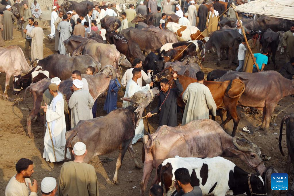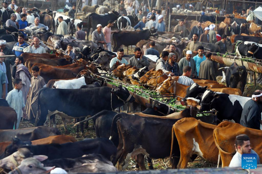 People trade at a livestock market ahead of the Eid al-Adha, on the outskirts of Giza, Egypt, on July 1, 2022. (Xinhua/Ahmed Gomaa)