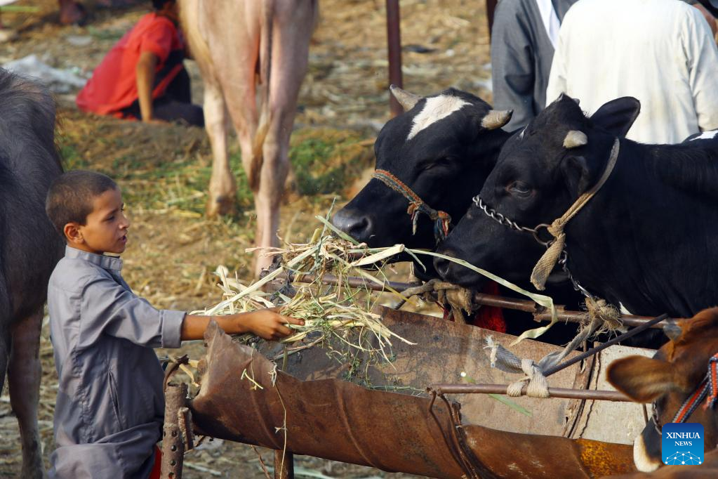 A boy feeds cows at a livestock market ahead of the Eid al-Adha, on the outskirts of Giza, Egypt, on July 1, 2022. (Xinhua/Ahmed Gomaa)