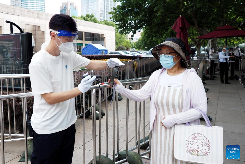 A visitor has her health code checked before entering Shanghai Museum in Shanghai, east China, July 1, 2022. (Xinhua/Ren Long)