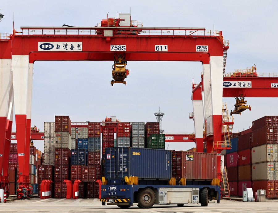 A truck carrying containers is seen at the container dock of Shanghai's Yangshan Port in east China, April 27, 2022. (Xinhua/Chen Jianli)