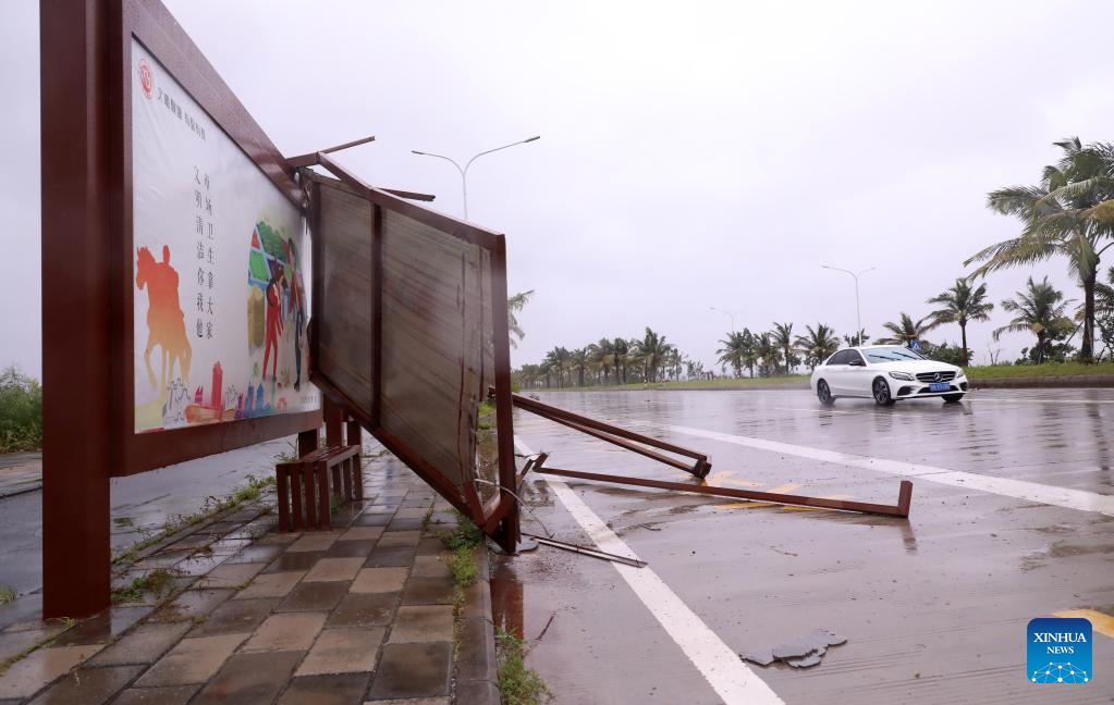 Photo taken on July 2, 2022 shows a bus stop sign damaged by typhoon in Maoming, south China's Guangdong Province. Chaba, the third typhoon of the year, made landfall in the coastal area of Maoming City at around 3 p.m. Saturday. (Xinhua/Huang Guobao)