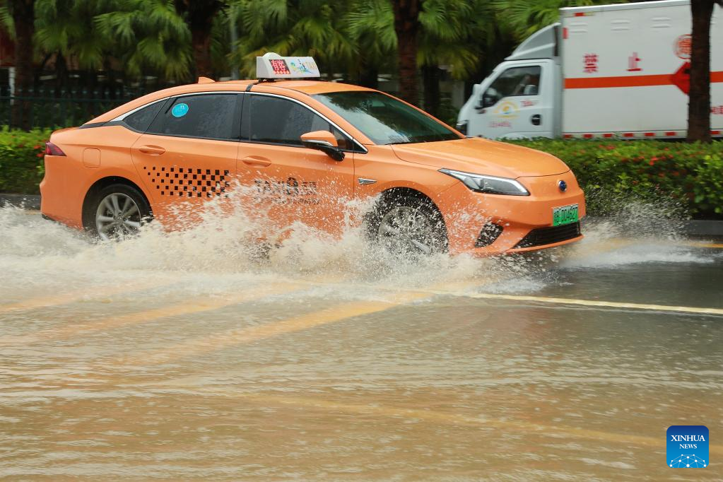 A taxi drives through a waterlogged street in Sanya, south China's Hainan Province, July 2, 2022. South China's island province of Hainan upgraded its emergency response level for Typhoon Chaba to Level II, the second-highest, the local government has announced. Chaba, the third typhoon of the year, has brought strong winds and heavy rains to Hainan while moving towards south China's Guangdong Province at a maximum speed of about 119 km per hour. (Photo by Yuan Yongdong/Xinhua)