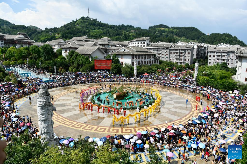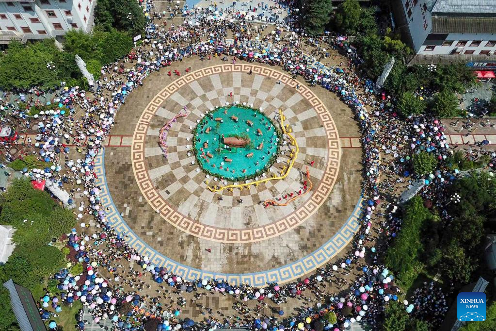 Aerial photo taken on July 2, 2022 shows people taking part in activities to celebrate "Liuyueliu", an ethnic festival, in Jianhe County of Qiandongnan Miao and Dong Autonomous Prefecture, southwest China's Guizhou Province. Annual celebration of the ethnic festival "Liuyueliu" lasts from July 2 to 5 here in Jianhe County. Local people of various ethnic groups will take part in activities like dragon dance as well as folk singing and dancing during the celebration. (Photo by Yang Jiameng/Xinhua)