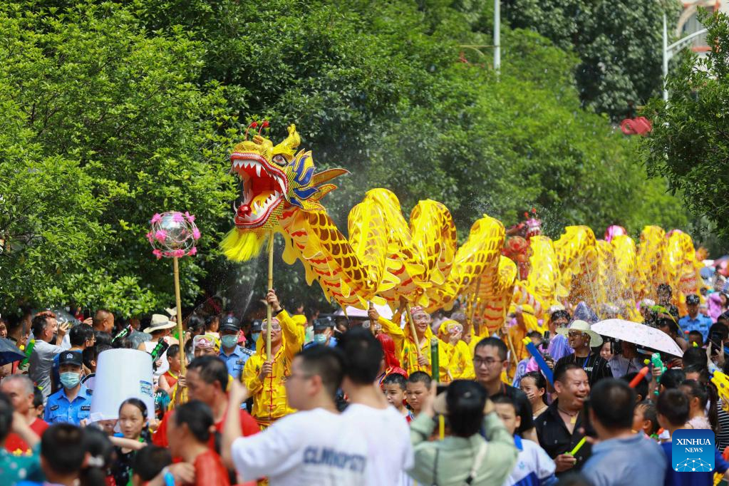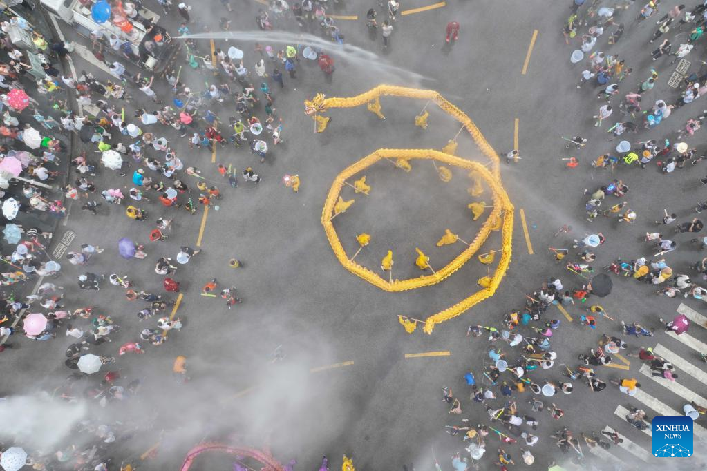 People perform dragon dance among splashed water to celebrate "Liuyueliu", an ethnic festival, in Jianhe County of Qiandongnan Miao and Dong Autonomous Prefecture, southwest China's Guizhou Province, July 2, 2022. Annual celebration of the ethnic festival "liuyueliu" lasts from July 2 to 5 here in Jianhe County. Local people of various ethnic groups will take part in activities like dragon dance as well as folk singing and dancing during the celebration. (Xinhua/Yang Wenbin)
