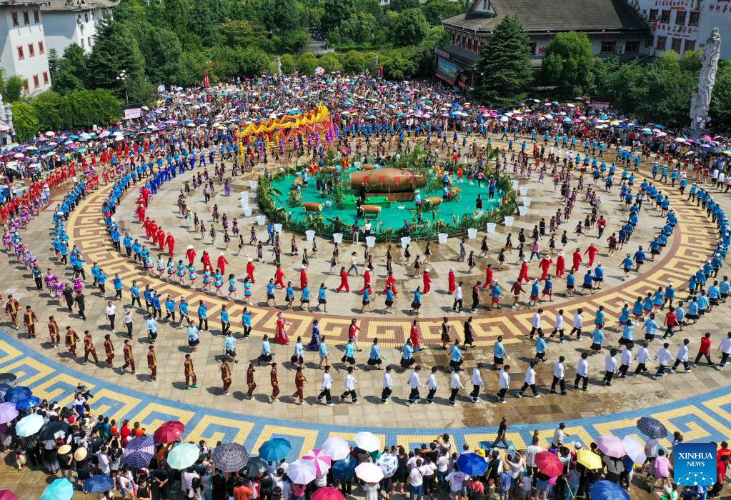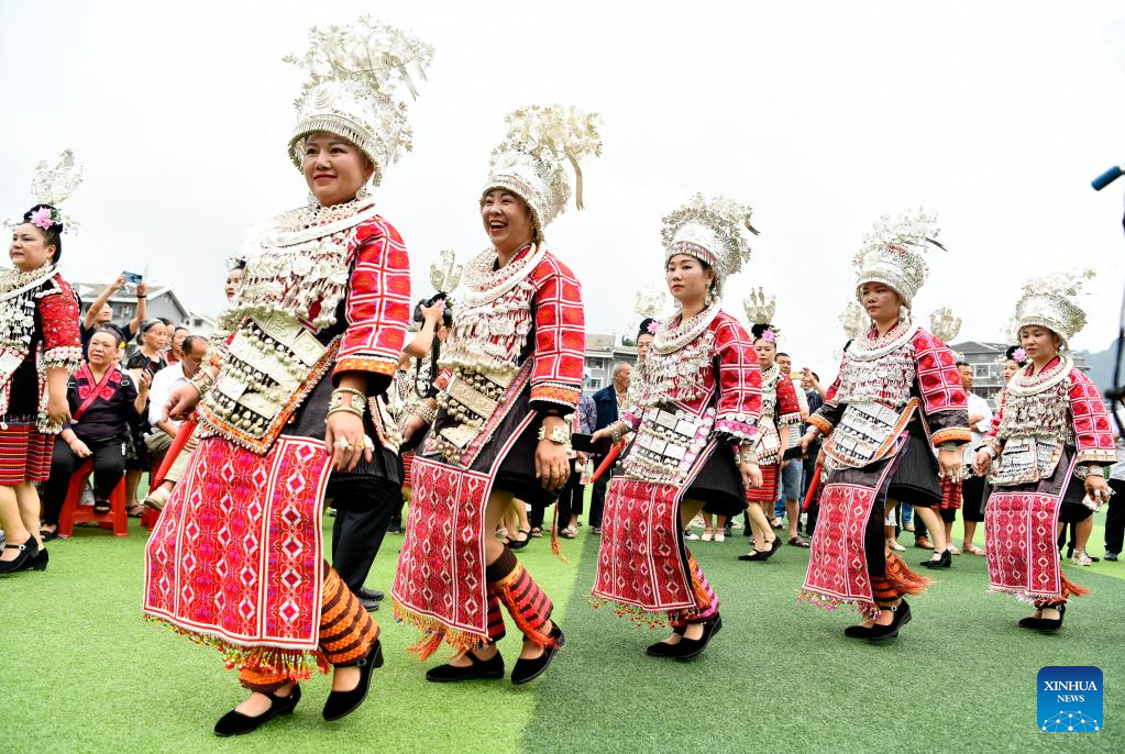 Women perform folk dance during activities to celebrate "Liuyueliu", an ethnic festival, in Jianhe County of Qiandongnan Miao and Dong Autonomous Prefecture, southwest China's Guizhou Province, July 2, 2022. Annual celebration of the ethnic festival "liuyueliu" lasts from July 2 to 5 here in Jianhe County. Local people of various ethnic groups will take part in activities like dragon dance as well as folk singing and dancing during the celebration. (Xinhua/Yang Wenbin)