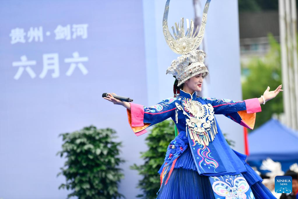 A woman performs folk dance during activities to celebrate "Liuyueliu", an ethnic festival, in Jianhe County of Qiandongnan Miao and Dong Autonomous Prefecture, southwest China's Guizhou Province, July 2, 2022. Annual celebration of the ethnic festival "liuyueliu" lasts from July 2 to 5 here in Jianhe County. Local people of various ethnic groups will take part in activities like dragon dance as well as folk singing and dancing during the celebration. (Xinhua/Yang Wenbin)
