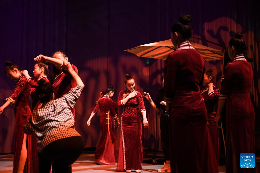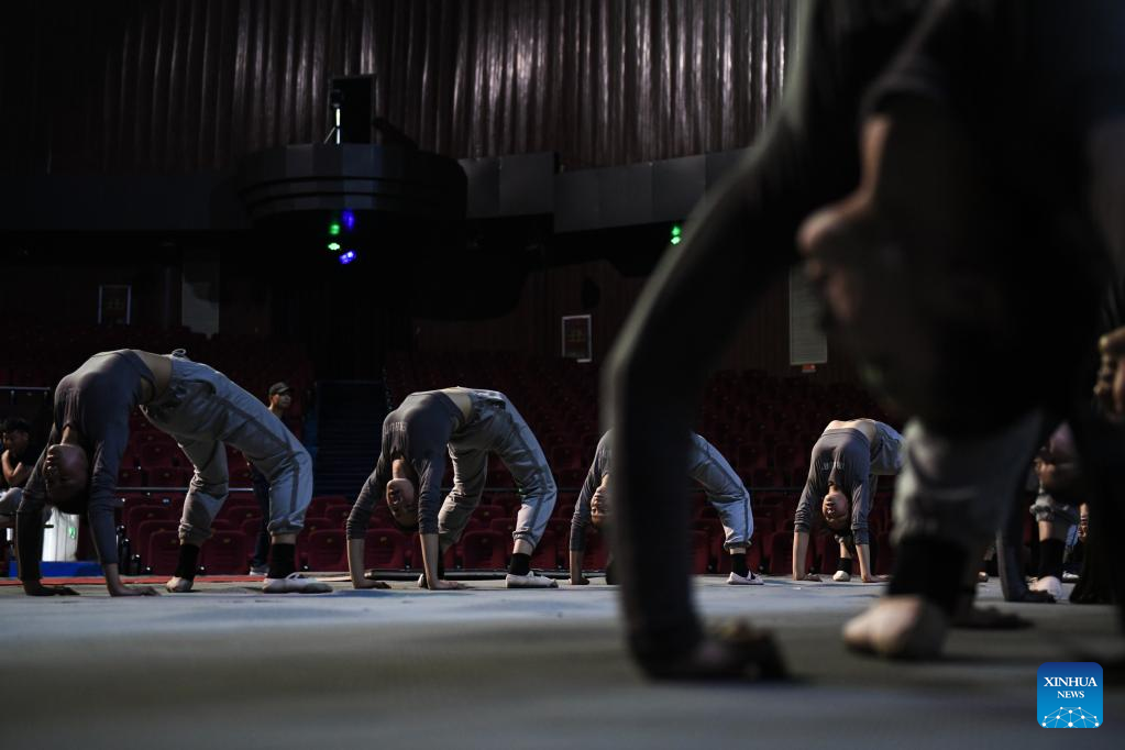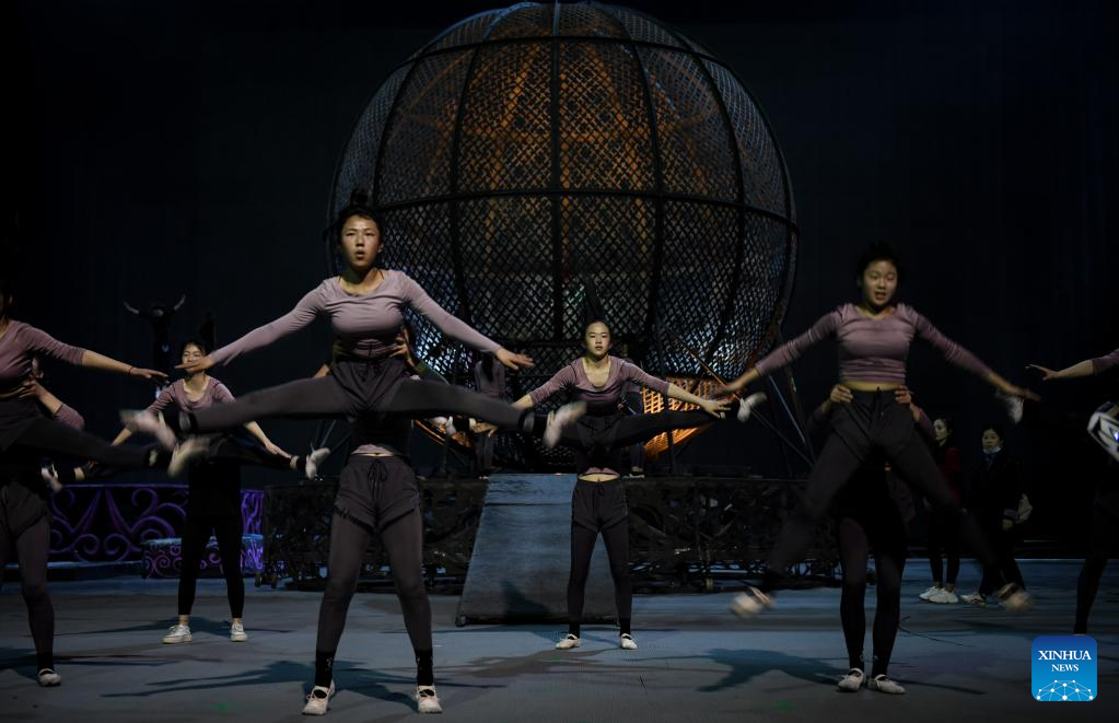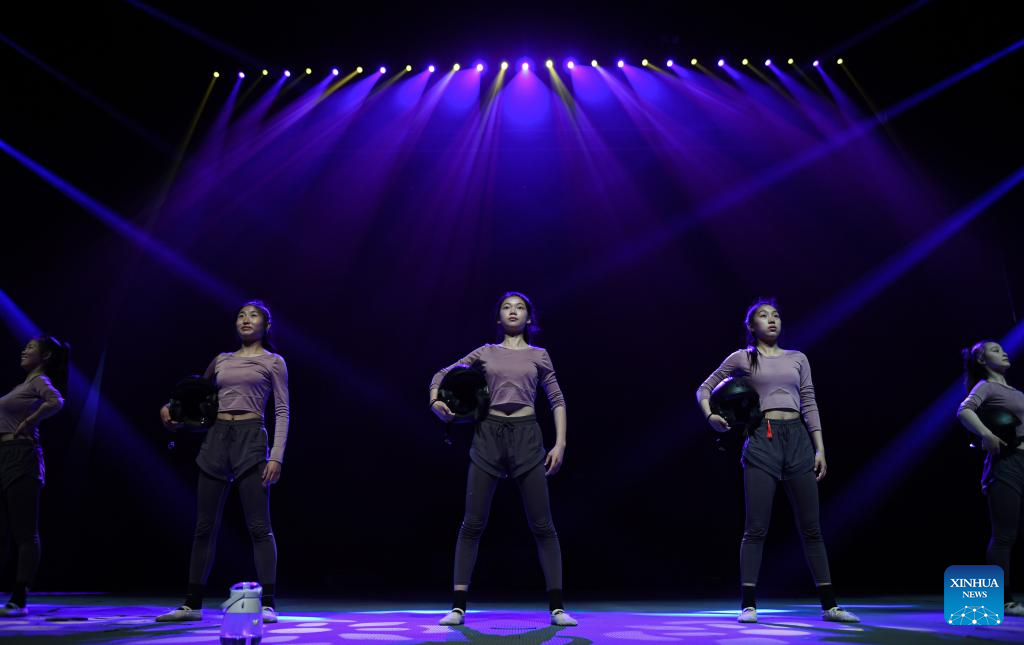 Members of an acrobatic motorcycle team take part in a dance training in Puyang, central China's Henan Province, April 22, 2022. A total of 16 female motorcyclists from Puyang Acrobatic Art School formed an acrobatic team in March 2021. They have been practicing hard in an attempt to break the Guinness World Record for most female motorcyclists in a Globe of Death.