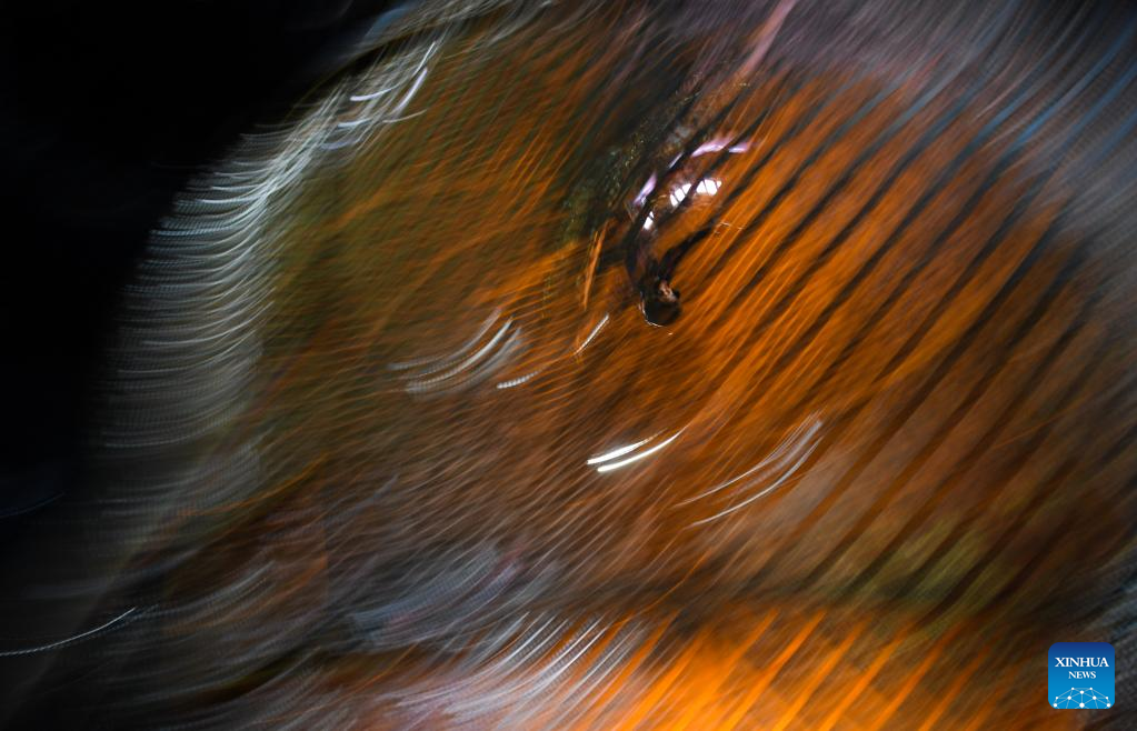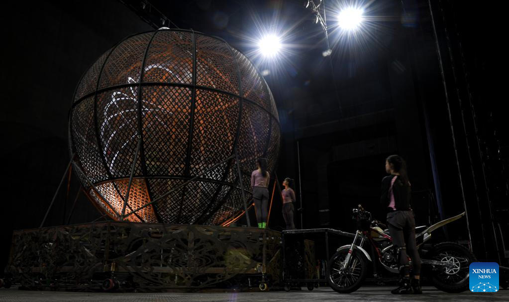Wang Tingting, member of an acrobatic motorcycle team, takes part in a training in Puyang, central China's Henan Province, April 22, 2022. A total of 16 female motorcyclists from Puyang Acrobatic Art School formed an acrobatic team in March 2021. They have been practicing hard in an attempt to break the Guinness World Record for most female motorcyclists in a Globe of Death.