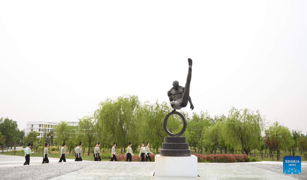 Members of an acrobatic motorcycle team walk in Puyang Acrobatic Art School in Puyang, central China's Henan Province, April 26, 2022. A total of 16 female motorcyclists from Puyang Acrobatic Art School formed an acrobatic team in March 2021. They have been practicing hard in an attempt to break the Guinness World Record for most female motorcyclists in a Globe of Death.
