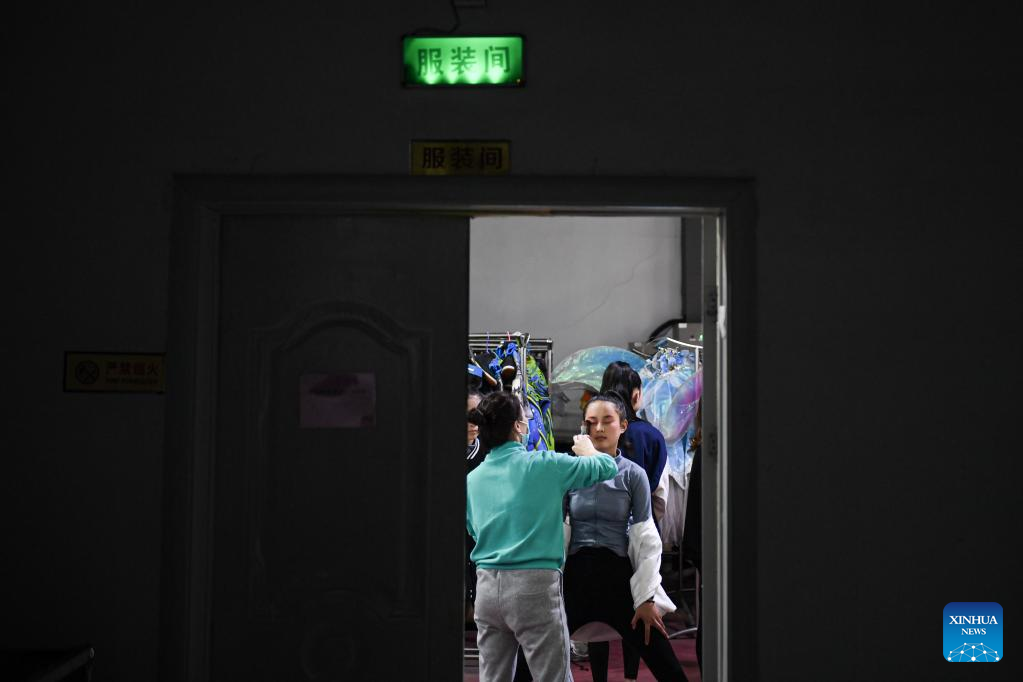 Li Yuyu, member of an acrobatic motorcycle team, puts on make-up before a trial performance in Puyang, central China's Henan Province, April 27, 2022. A total of 16 female motorcyclists from Puyang Acrobatic Art School formed an acrobatic team in March 2021. They have been practicing hard in an attempt to break the Guinness World Record for most female motorcyclists in a Globe of Death.