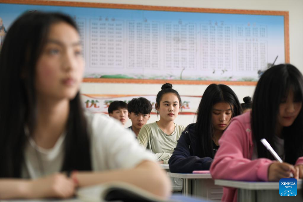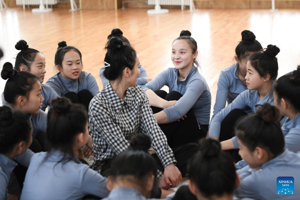 Li Yuyu (3rd R), member of an acrobatic motorcycle team, takes a class at Puyang Acrobatic Art School in Puyang, central China's Henan Province, April 26, 2022. A total of 16 female motorcyclists from Puyang Acrobatic Art School formed an acrobatic team in March 2021. They have been practicing hard in an attempt to break the Guinness World Record for most female motorcyclists in a Globe of Death.