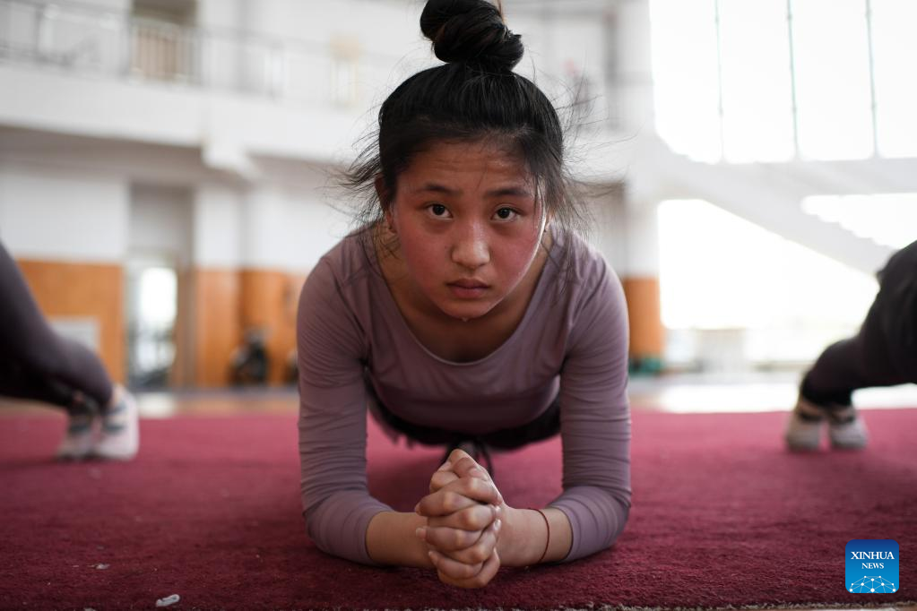 Zhang Ran, member of an acrobatic motorcycle team, takes part in a physical training in Puyang, central China's Henan Province, April 19, 2022. A total of 16 female motorcyclists from Puyang Acrobatic Art School formed an acrobatic team in March 2021. They have been practicing hard in an attempt to break the Guinness World Record for most female motorcyclists in a Globe of Death.