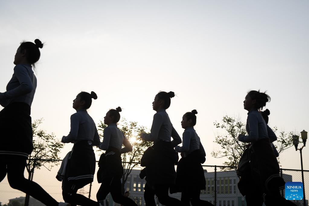 Members of an acrobatic motorcycle team take part in a morning exercise in Puyang, central China's Henan Province, April 20, 2022. A total of 16 female motorcyclists from Puyang Acrobatic Art School formed an acrobatic team in March 2021. They have been practicing hard in an attempt to break the Guinness World Record for most female motorcyclists in a Globe of Death.