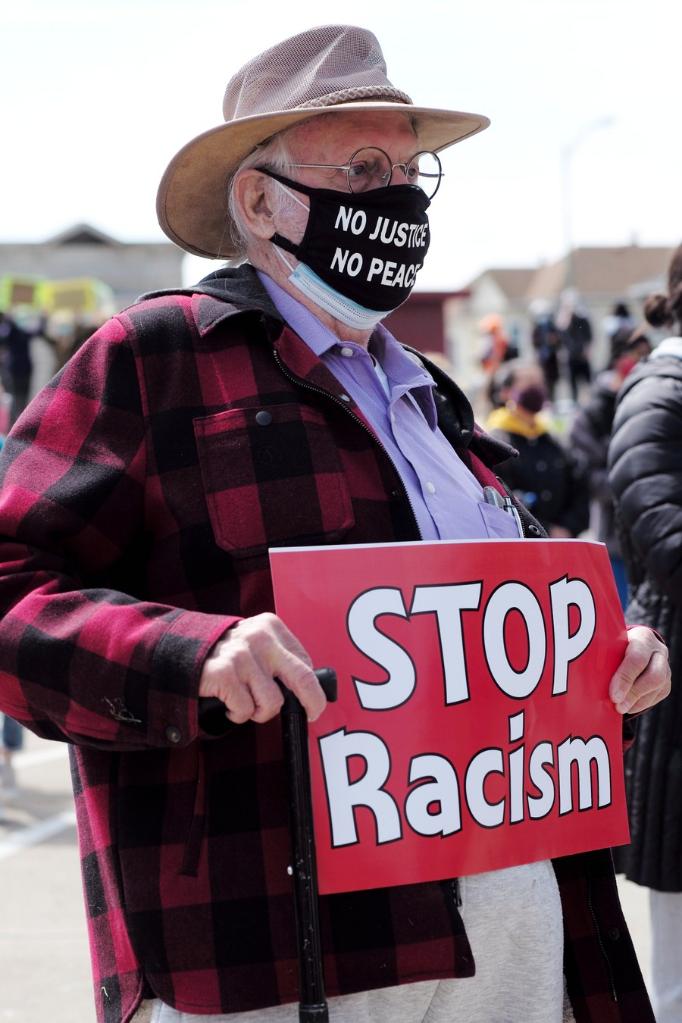 A senior citizen holding a sign takes part in a Stop Asian Hate rally in Oakland, San Francisco Bay Area, the United States, April 3, 2021. (Xinhua/Wu Xiaoling)