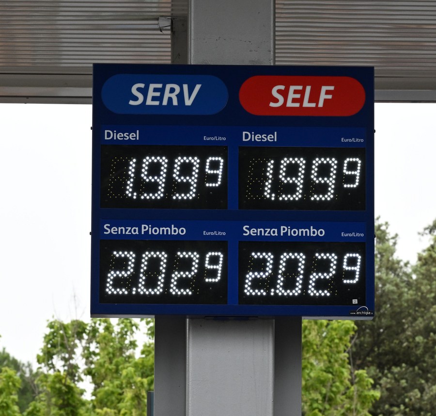 Gasoline and diesel prices are displayed near a gas station in Rome, Italy, June 23, 2022.(Photo by Alberto Lingria/Xinhua)