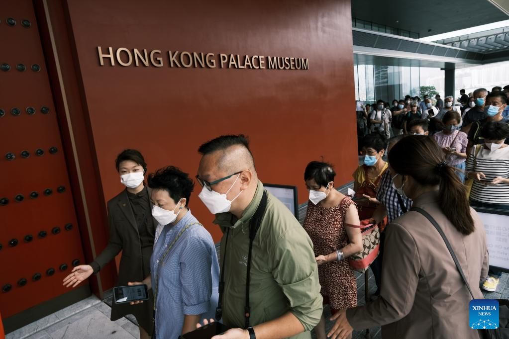 People wait in line to enter the Hong Kong Palace Museum in Hong Kong, south China, July 3, 2022. The Hong Kong Palace Museum, located in the West Kowloon Cultural District of the Hong Kong Special Administrative Region, was open to the public on Sunday. (Xinhua/Wang Shen)