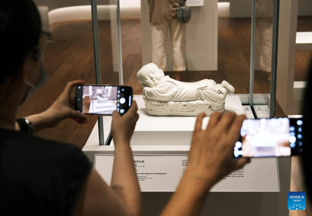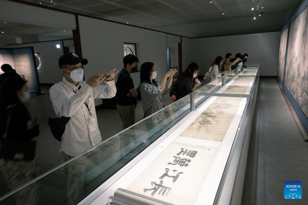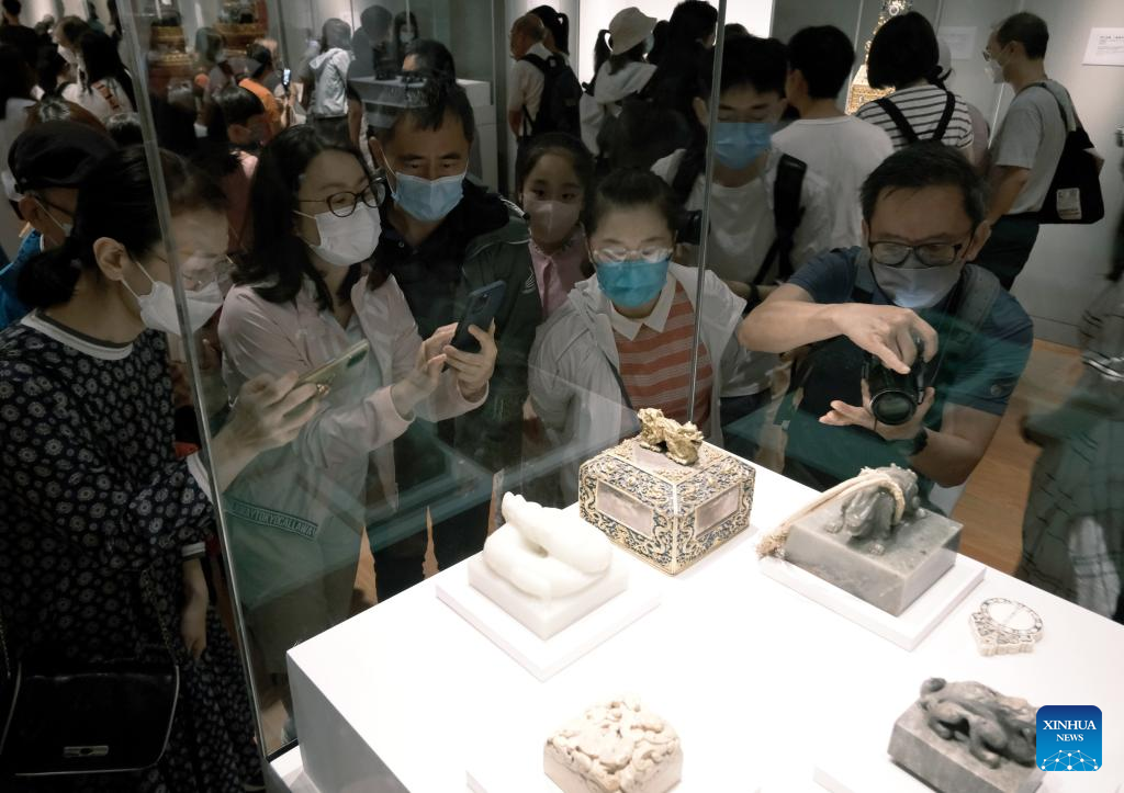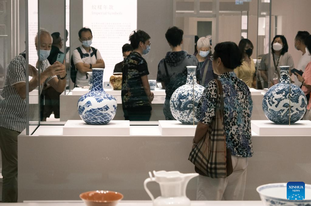 Visitors take photos of an exhibit at the Hong Kong Palace Museum in Hong Kong, south China, July 3, 2022. The Hong Kong Palace Museum, located in the West Kowloon Cultural District of the Hong Kong Special Administrative Region, was open to the public on Sunday. (Xinhua/Wang Shen)