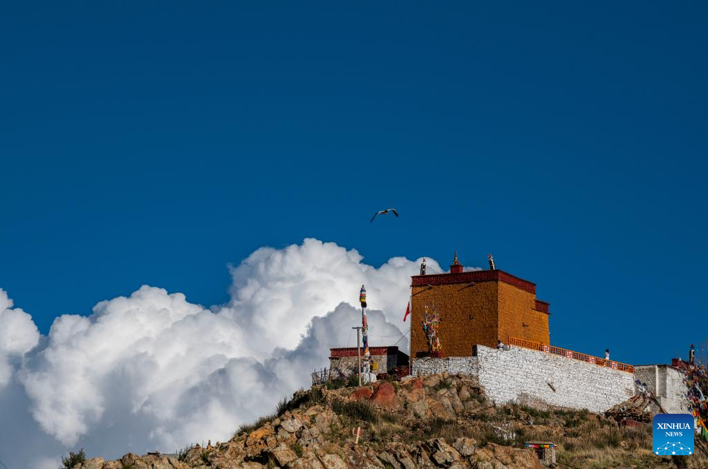 Aerial photo taken on July 2, 2022 shows the Rutok Temple near the Yamdrok Lake in Nagarze County of Shannan City, southwest China's Tibet Autonomous Region. (Xinhua/Sun Fei)