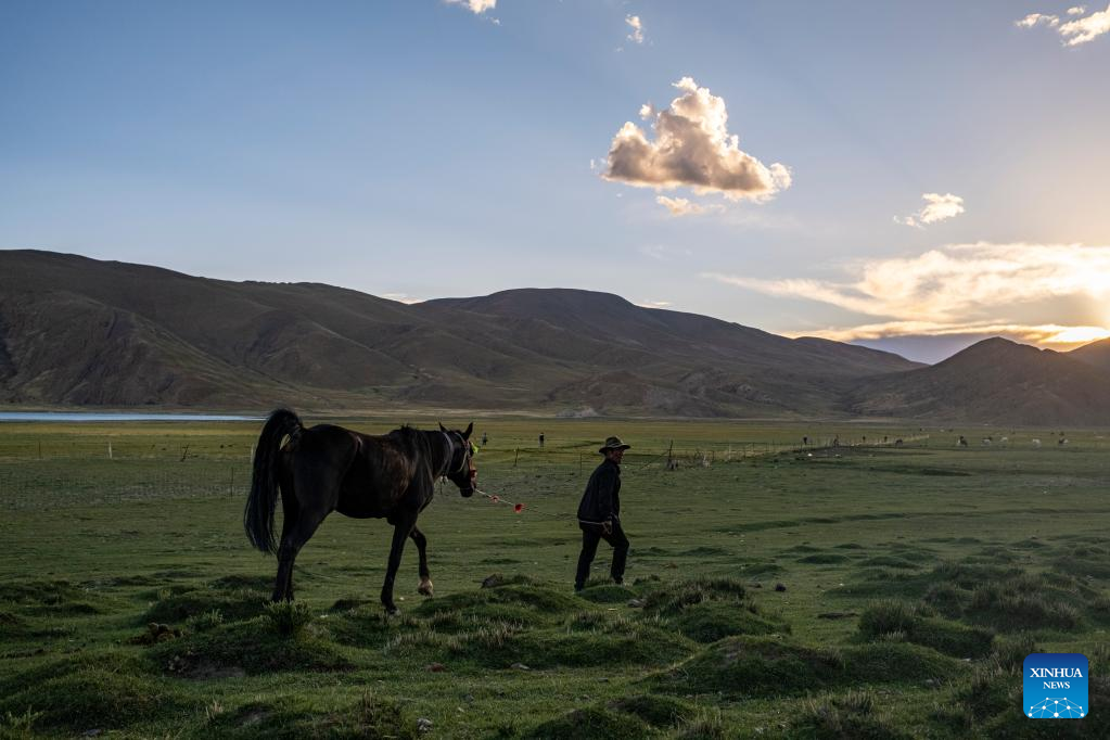 A herder walks his horse at a ranch near Yamdrok Lake in Nagarze County of Shannan City, southwest China's Tibet Autonomous Region, July 2, 2022. (Xinhua/Sun Fei)