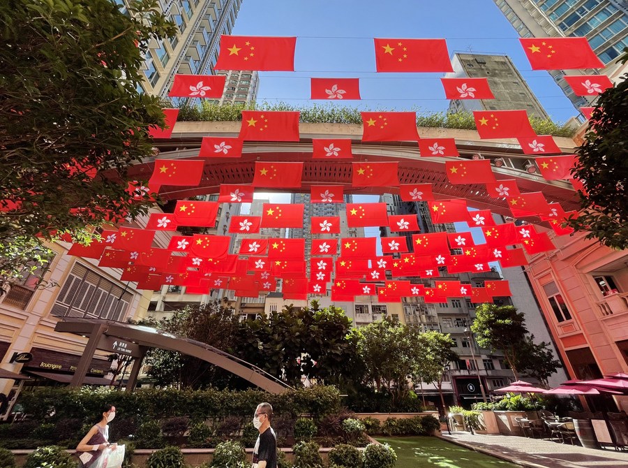 China's national flags and the Hong Kong Special Administrative Region (HKSAR) flags fly along the Lee Tung Avenue in Hong Kong, south China, June 28, 2022. (Xinhua/Li Gang)