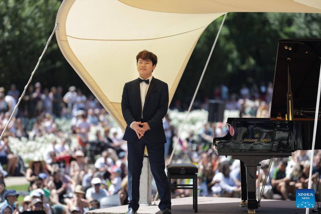 Chinese pianist Rao Hao greets the audience during an open-air Chopin concert at the Royal Lazienki Park in Warsaw, Poland, July 3, 2022. (Xinhua/Zhou Nan)