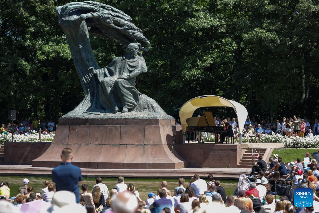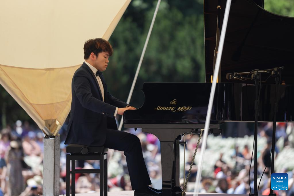 Chinese pianist Rao Hao plays the piano during an open-air Chopin concert at the Royal Lazienki Park in Warsaw, Poland, July 3, 2022. (Xinhua/Zhou Nan)