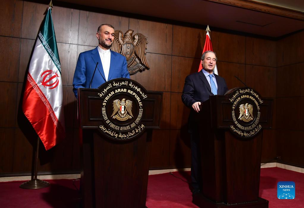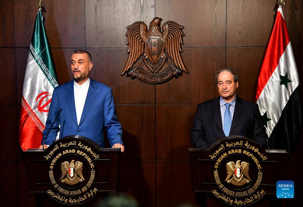 Syrian Foreign Minister Faisal Mekdad (R) and Iranian Foreign Minister Hossein Amir-Abdollahian hold a joint press conference at the Syrian Foreign Ministry in Damascus, Syria on July 2, 2022. Faisal Mekdad on Saturday evening said his country welcomes any role played by Iran in easing the tension between Syria and Turkey and achieving political progress. (Photo by Ammar Safarjalani/Xinhua)