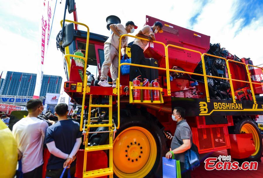 Visitors take a close look on a cotton picker during the 2022 agricultural machinery expo in Urumqi, capital of northwest China's Xinjiang Uyghur Autonomous Region, July 3, 2022. (Photo: China News Service/Liu Xin)
