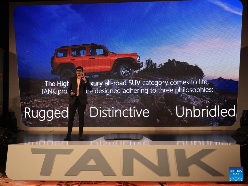 Gautam Arun, product director of Great Wall Motor Middle East Company, introduces the "Tank 300" off-road vehicle at a press conference in Riyadh, Saudi Arabia, on July 3, 2022. Two off-roaders from China's Great Wall Motor Company have made their overseas debut in Riyadh. (Xinhua/Wang Haizhou)